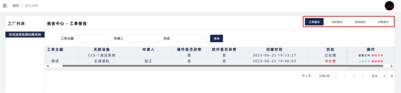 報(bào)告中 心 一級(jí)界面可總體預(yù)覽設(shè)備狀態(tài),二級(jí)界面深入結(jié)合工單記錄、油檢報(bào)告、巡檢報(bào)告、診斷報(bào)告四大核心模塊,構(gòu)建設(shè)備運(yùn)維全流程閉環(huán)管理體系。