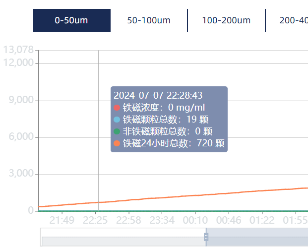 通過(guò)人機(jī)界面可以直觀查詢(xún)?nèi)?0 ℃黏度、實(shí)時(shí)黏度、油溫、水分、鐵磁顆粒、非鐵磁顆粒等數(shù)據(jù)的歷史曲線(xiàn)。