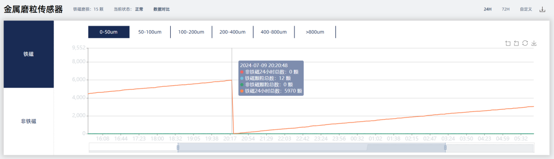 同時(shí),系統(tǒng)內(nèi)部傳感器運(yùn)用磁電技術(shù)來(lái)監(jiān)測(cè)鐵磁與非鐵磁顆粒的數(shù)量與趨勢(shì),分別反映齒輪、軸承等鐵質(zhì)部件及軸承保持架、軸瓦等非鐵質(zhì)部件的磨損狀態(tài)。